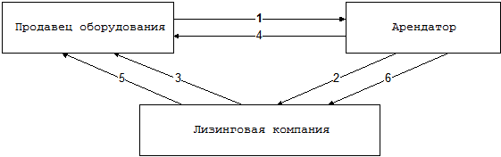 Компания, желающая арендовать оборудование с использованием финансовых средств лизинговой компании выбирает продавца необходимого оборудования с учетом качества и цены товара (1). Затем заключается договор об аренде с лизинговой компанией (2). Последняя договаривается с поставщиком о поставке оборудования (3) с поставкой его арендатору (4). Стоимость товара выплачивается поставщику, и лизинговая компания становится владельцем оборудования (5). Арендатель вносит арендные платежи (включая процент на финансирование) на протяжении всего периода использования оборудования (6).